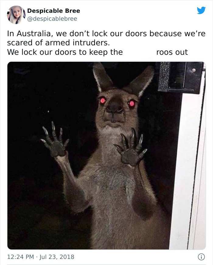 The kangaroo seems like a loving, caring, and cuddly animal to anyone who isn’t Australian… But in reality, the kangaroo is rather territorial, possessive, and knows how to throw a mean punch. Not only that, but they know how to open doors and come into your house and steal all of your food!